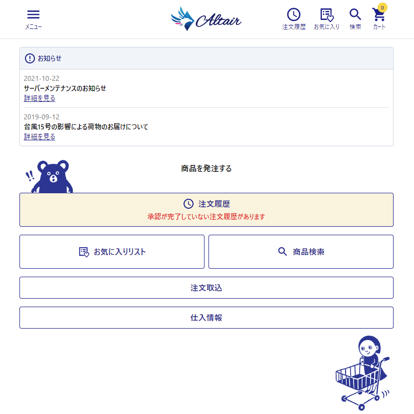 トップ画面 2026年01月14日 01:17 更新 トップページには、お知らせの表示、注文履歴、お気に入りスト、商品検索、仕入情報のメニューを表示しています左上にあるハンバーガーメニューからも各メニューに遷移することができます。 関連記事 Q)返品できない商品を教えてください 注文完了メールの受信設定