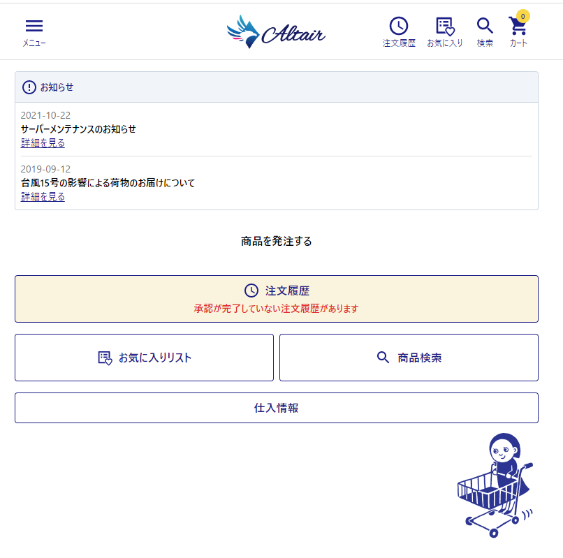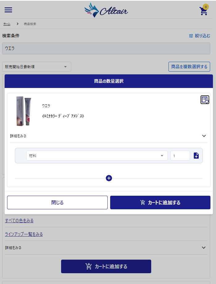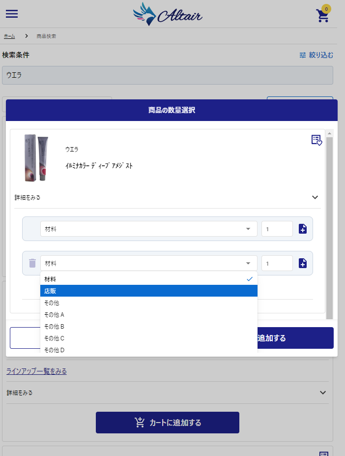 種別はデフォルトで【材料】数量は【1】個が入力されています。 【カートに追加する】をクリックするまでは追加されません。