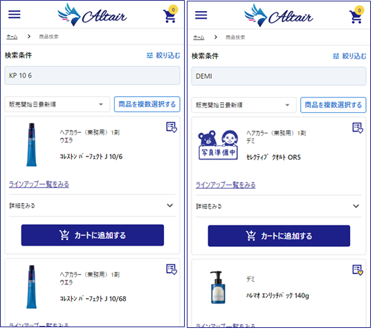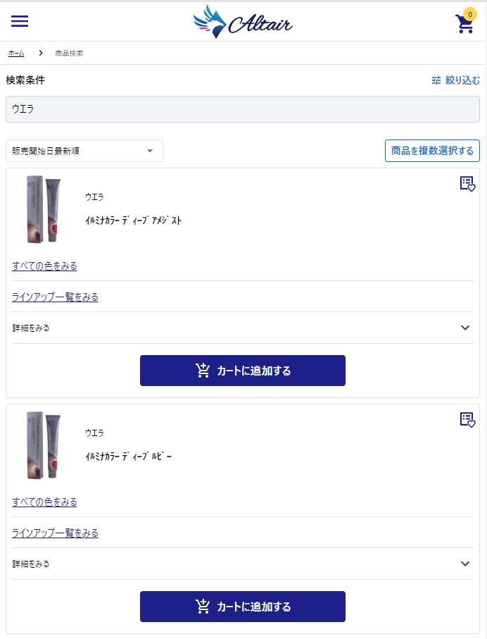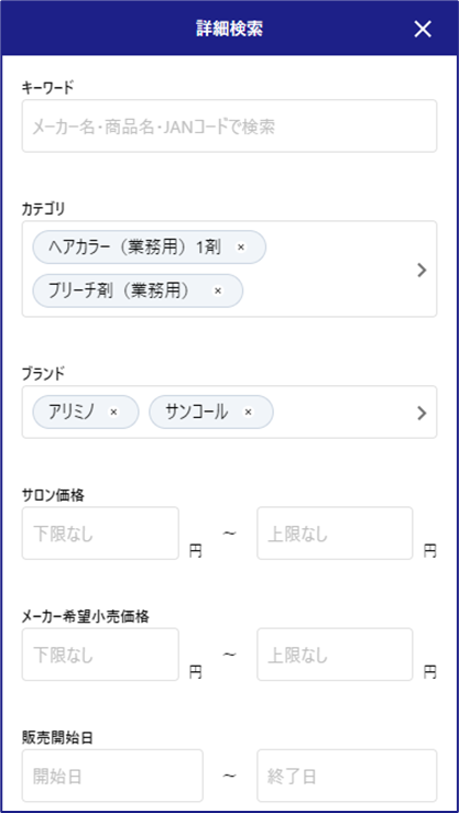 詳細検索では、先に挙げたキーワード、カテゴリー、ブランドに加えて、サロン価格、メーカー希望小売価格、販売開始日の条件を組み合わせて絞り込むことが可能です。