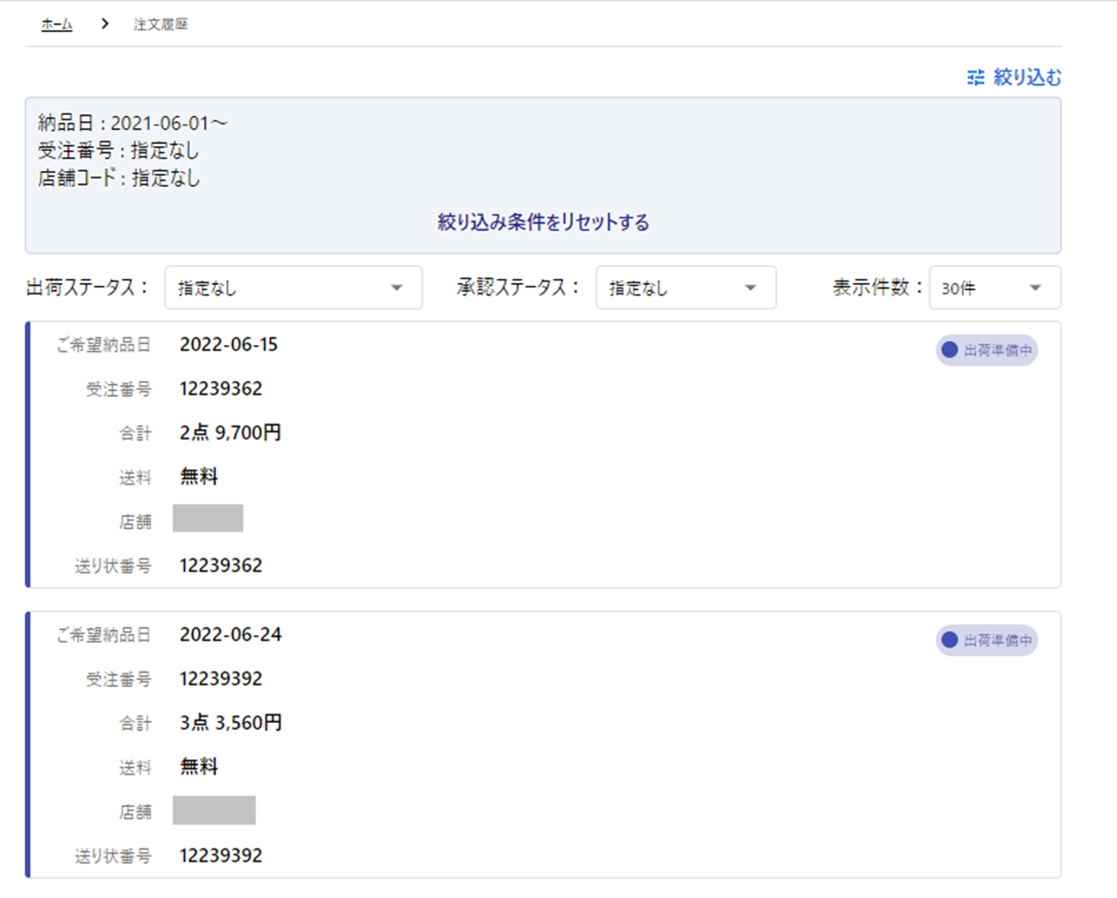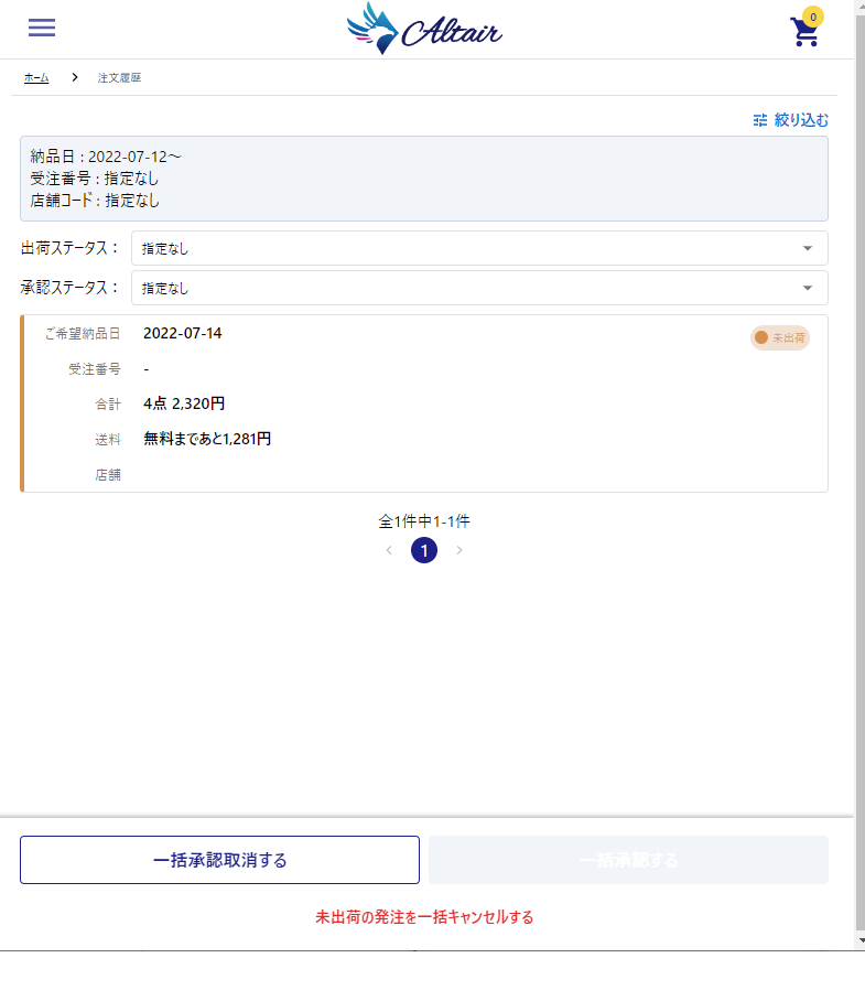 TOP画面より注文履歴を開くと本日以降の納品予定の注文履歴がみれます。