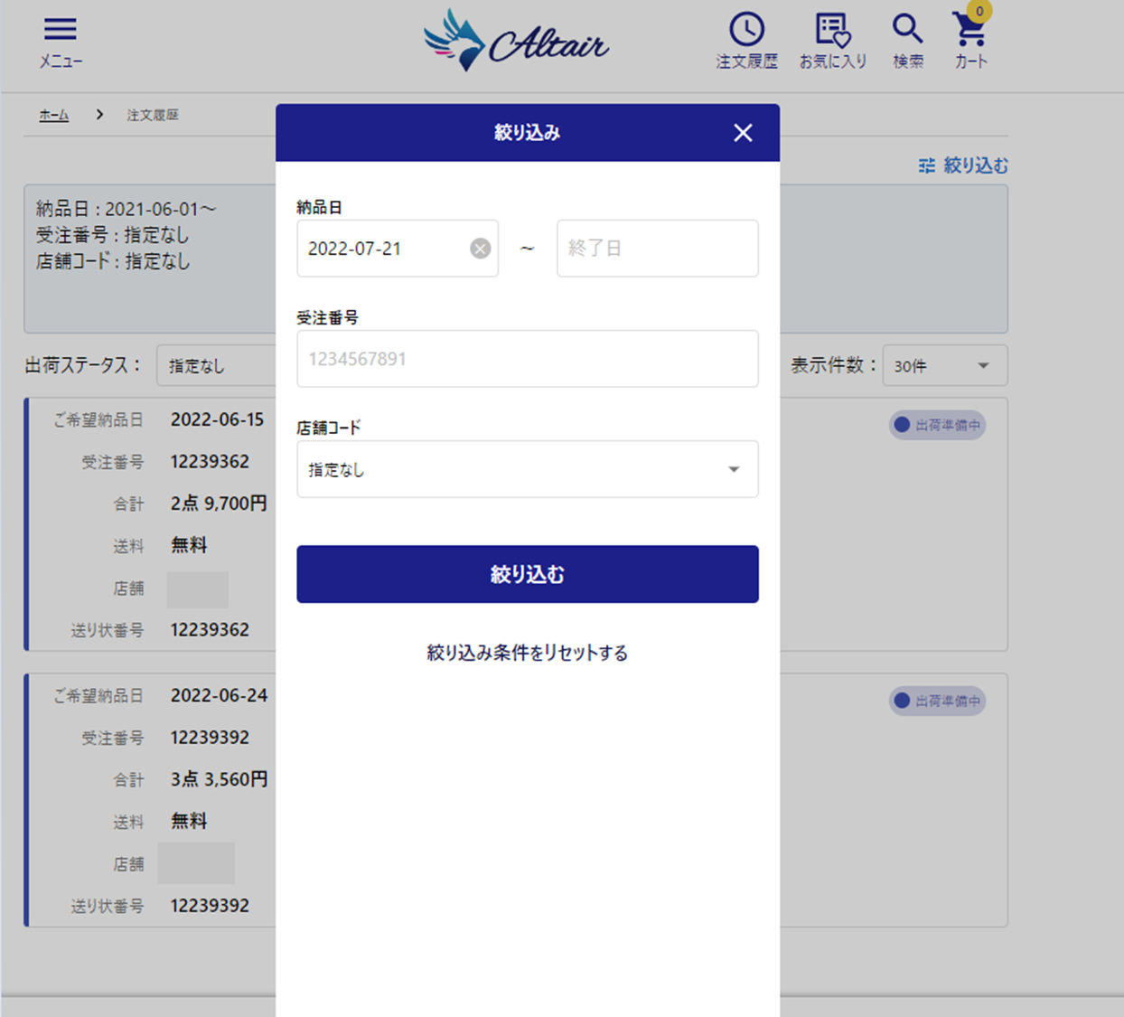 過去にさかのぼり注文履歴を検索します