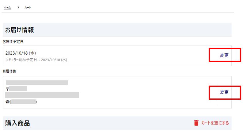 「お届け予定日」にはレギュラー納品日が表示されますが、【変更】を押すと日付の変更ができます。