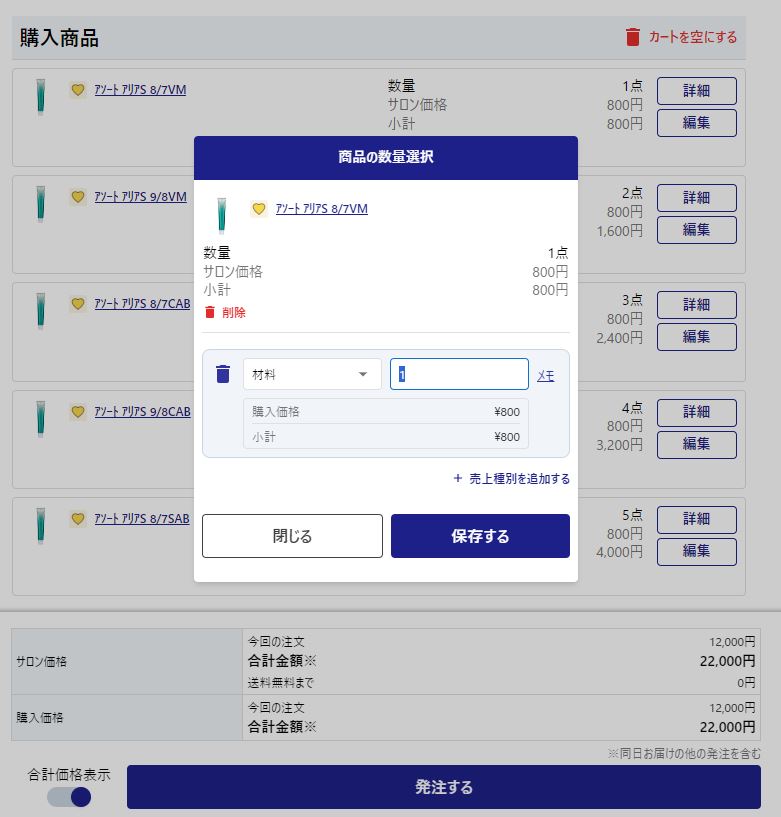 各商品の【編集】を押すと数量・売上種別の変更・メモの編集が可能です。