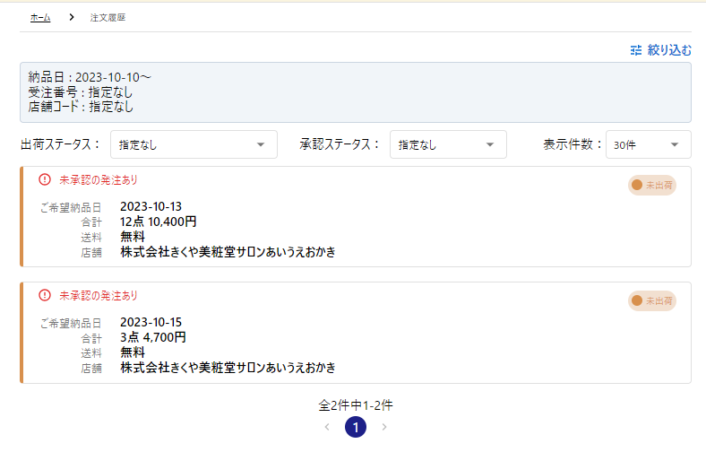 TOP画面より注文履歴を開くと本日以降の納品予定の注文履歴がみれます。