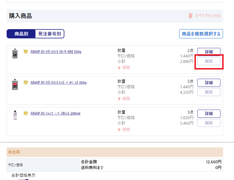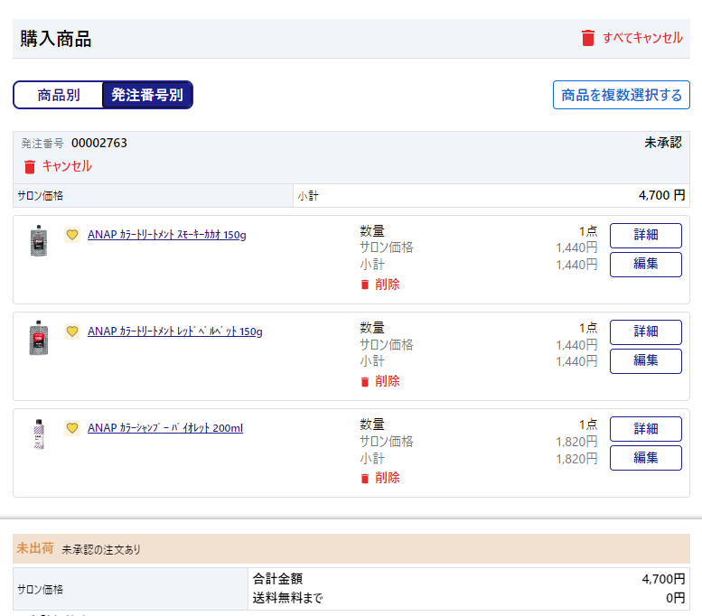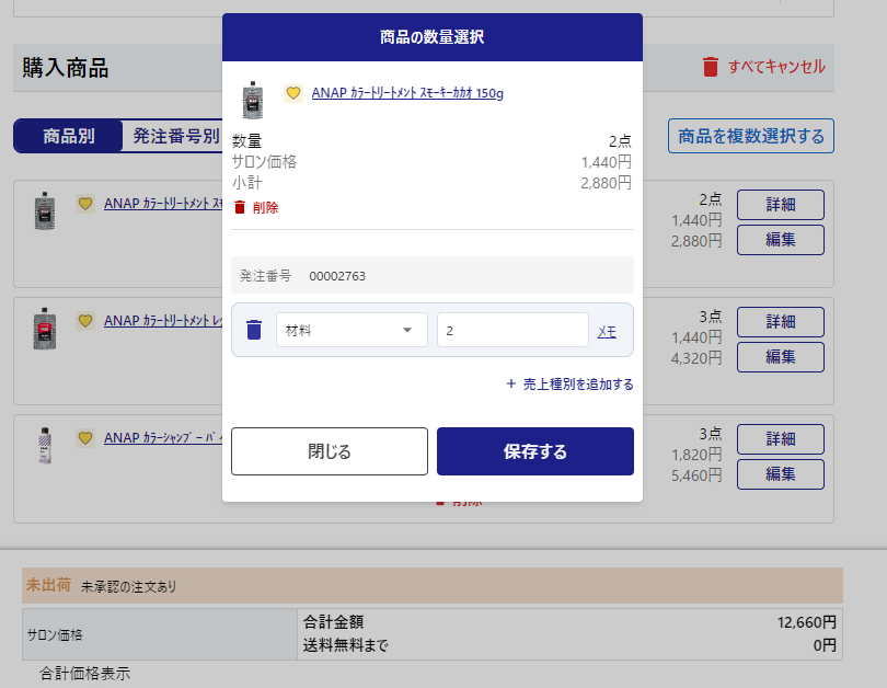 「商品別」または「発注番号別」どちらからでも編集可能です。 編集を押しての個数の変更をします。個数の増減と個数を0個にすることができます。