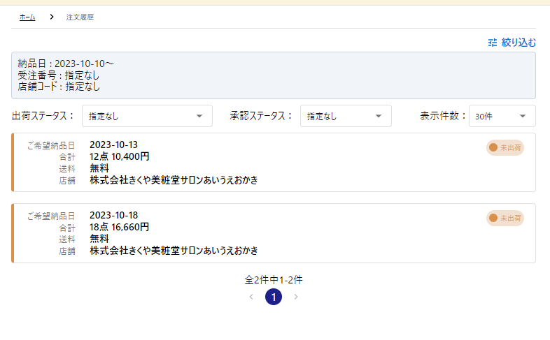 TOP画面より注文履歴を開くと本日以降の納品予定の注文履歴がみれます。 「未出荷」の注文が編集できます。該当の納品日の注文を確認します。
