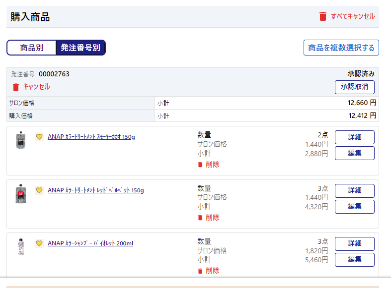 「注文別」の「一括承認取消する」とは 承認権限をご利用いただいていない場合は注文すると同時に承認されたことになります。 同時配送分をすべて保留にしたい場合は承認を取り消します。