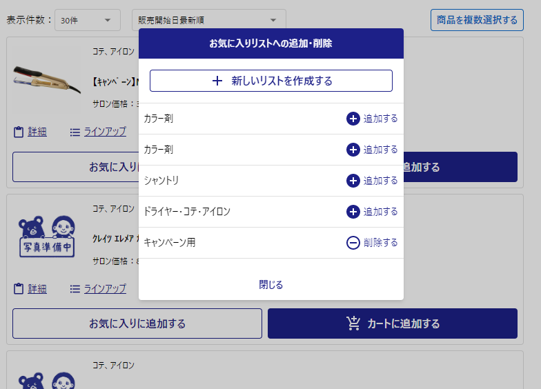 リストが表示されるので登録したいリストに【⊕追加する】をおします。 既に追加されている場合は[⊖削除する]になっています。 あらたにリストを作成することもできます