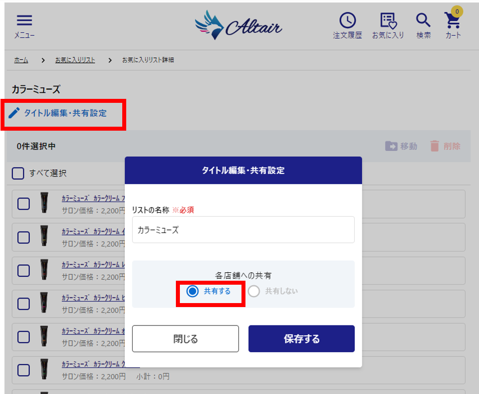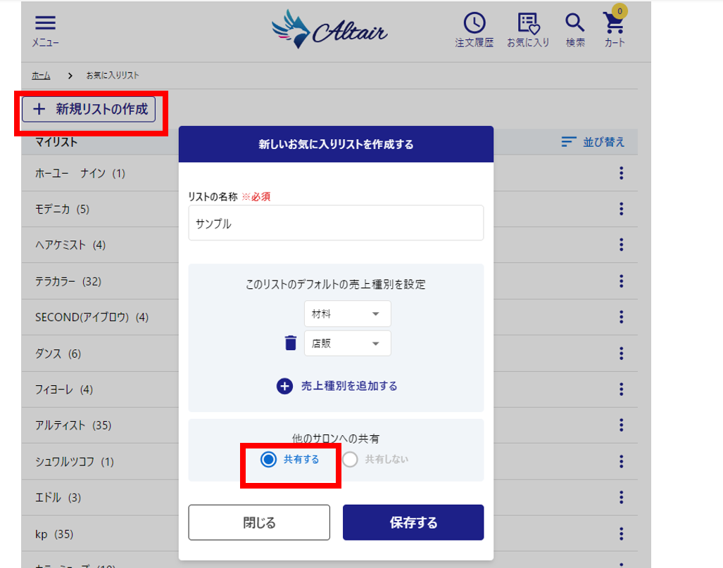 2. リストの設定画面下部にある「他のサロンへの共有」で「◎共有する」を選択してから「保存する」を押します