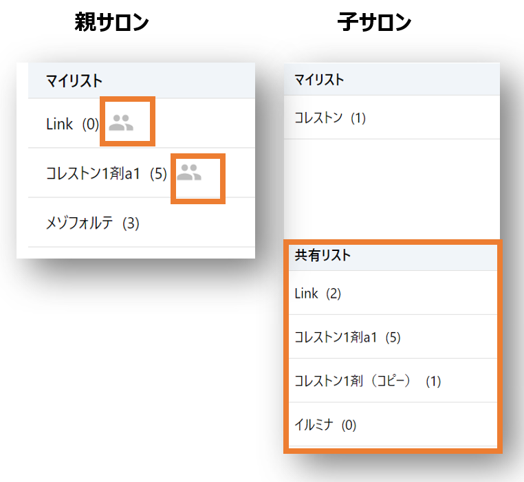 ※親サロンが共有リストを編集すると、子サロンの共有リストにも変更内容が反映されます